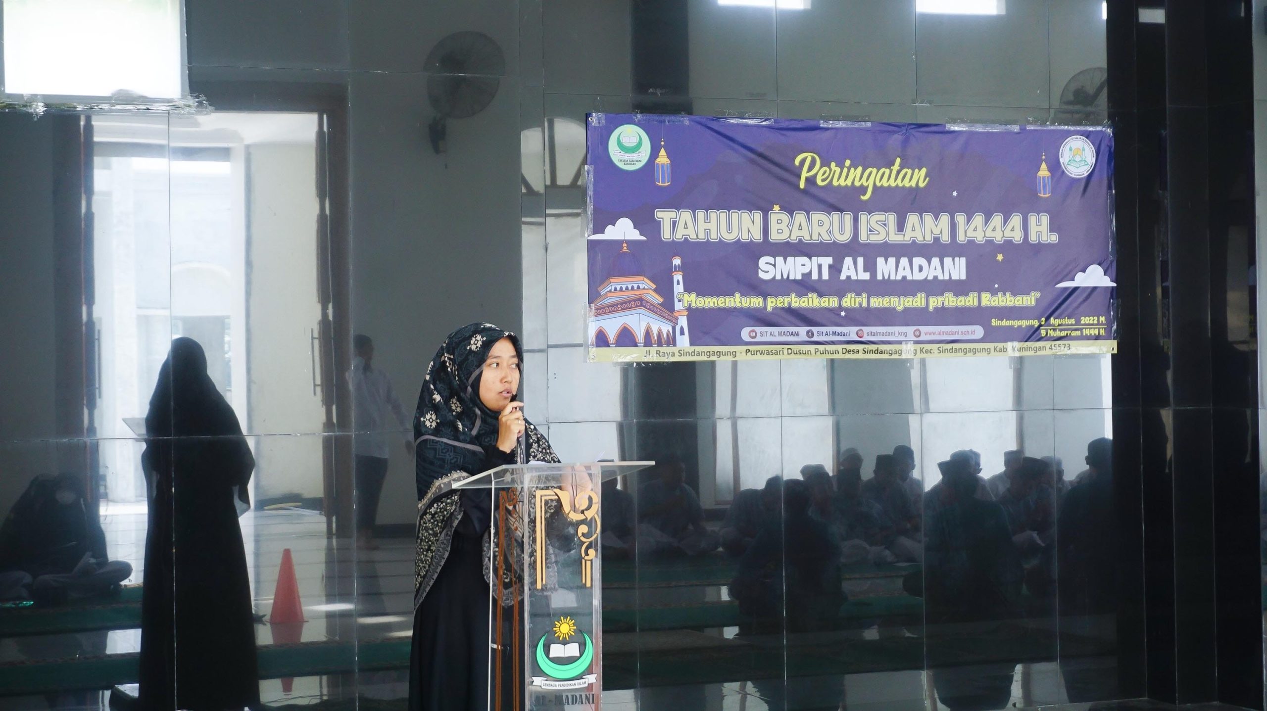 Kepala SMPIT Al Madani Nok Sindi Amelia, S.Pd. mengatakan dalam pembukaan peringatan hari besar islam 1 Muharram 1444 Hijriyah. “Jadikan momentum ini sebagai tahapan kita memperbaiki diri sebagaimana selaras dengan tema kegiatan hari ini”.