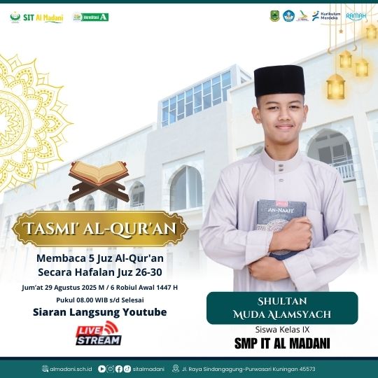 SMP IT Al Madani kembali menyelenggarakan kegiatan Tasmi’ Al-Qur’an 5 Juz. Acara ini menampilkan siswa-siswi yang membaca Al-Qur’an dengan metode hafalan tanpa melihat mushaf. Program ini menjadi salah satu kegiatan unggulan sekolah dalam membina generasi Qur’ani yang berakhlak mulia.